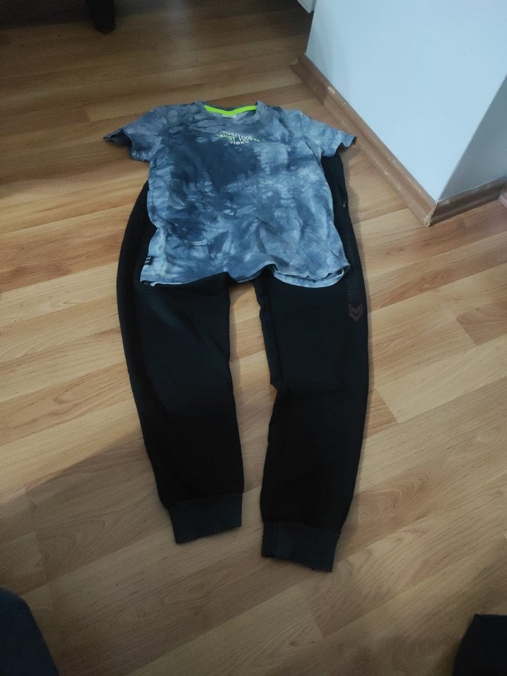 Gri batik desenli, bol kesim erkek sweatshirt ve siyah denim eşofman, sokak modasını yansıtan rahat ve şık bir kombin.