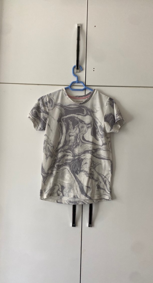 Gri batik desenli, kısa kollu, yuvarlak yakalı hamile tişörtü. Rahat kesimi ve dökümlü tasarımıyla günlük kullanıma uygundur.