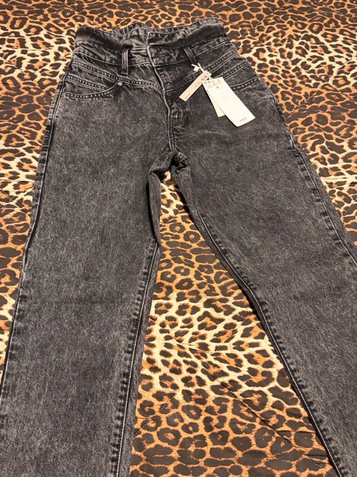 Gri batik desenli denim kot pantolon, bol kesim, kemerli ve midi boyda, günlük sokak stili için uygun.