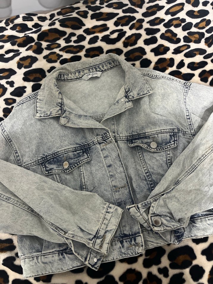 Kadınlar için gri batik desenli, düğmeli, uzun kollu, yakalı ve bol kesim denim ceket. Günlük kullanıma uygundur.