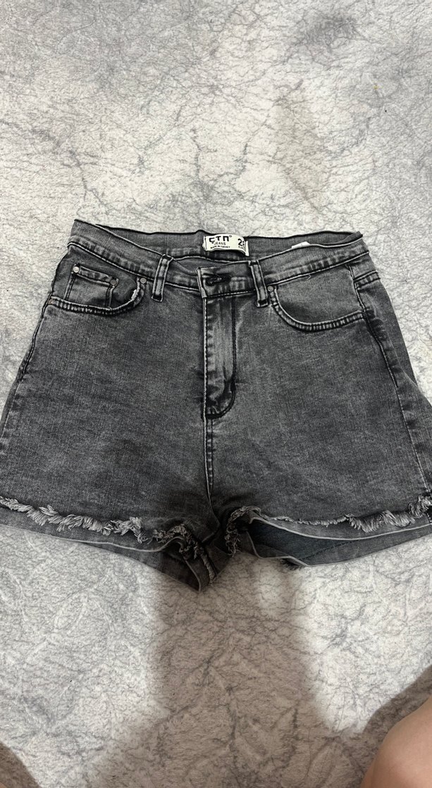 Gri batik desenli, bol kesim kadın denim mini şort, yıpranmış detaylı etek ucu ile günlük sokak stili için uygundur.