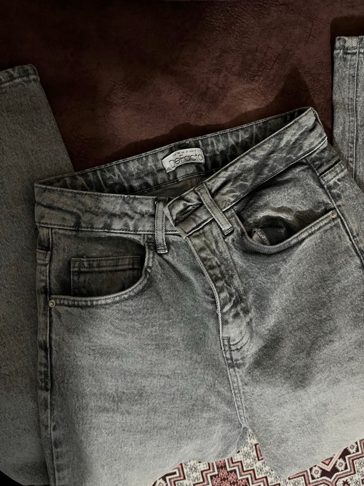 Gri batik desenli kadın denim pantolon, bağlamalı beli ve normal kesimiyle günlük kullanıma uygundur.