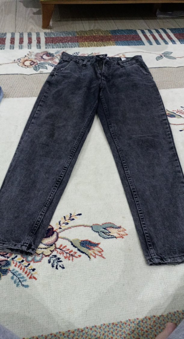 Gri batik desenli, bol kesim, tokalı kadın denim pantolon. Günlük rahat kullanıma uygundur.