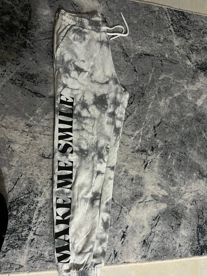 Gri batik desenli, bol kesim kadın eşofman altı. Elastik bel ve paça, yanlarda 'MAKE ME SMILE' baskısı bulunur. Sokak stili ve athleisure için uygundur. Son fotoğrafda belirtildiği gibi küçücük bir ruj lekesi var muhtemelen çıkar bayadır dolapta