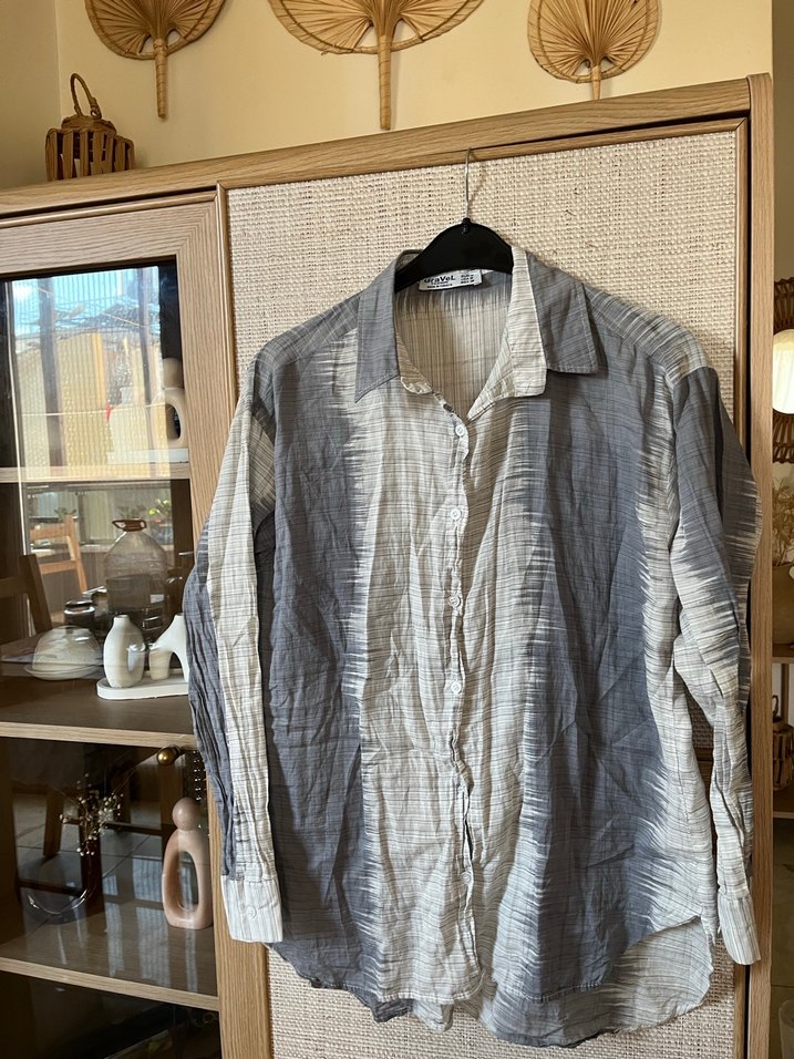 Yumuşak keten kumaştan, gri batik desenli, uzun kollu ve yakalı, düğmeli, bol kesim kadın gömlek. Günlük kullanıma uygun.