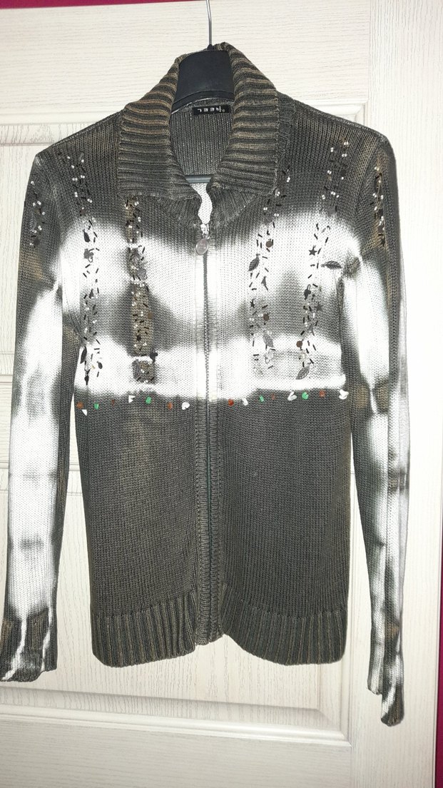 Gri renkte, uzun kollu, balıkçı yaka ve batik desenli örme triko hırka. Kesik detayları ve midi boyu ile günlük kullanıma uygundur.