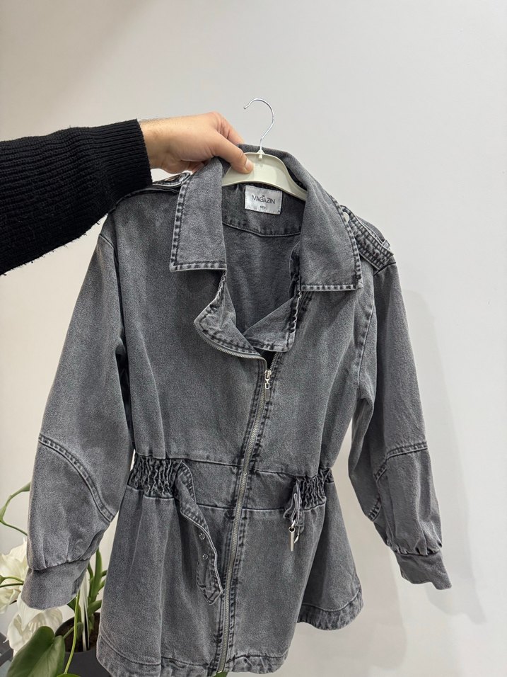 Gri renkte, batik desenli, kemerli ve kısa kesim olan bu denim ceket, yaka ve askılı kollara sahiptir. Rahat ve salaş tarzda, sokak stiline uygundur.