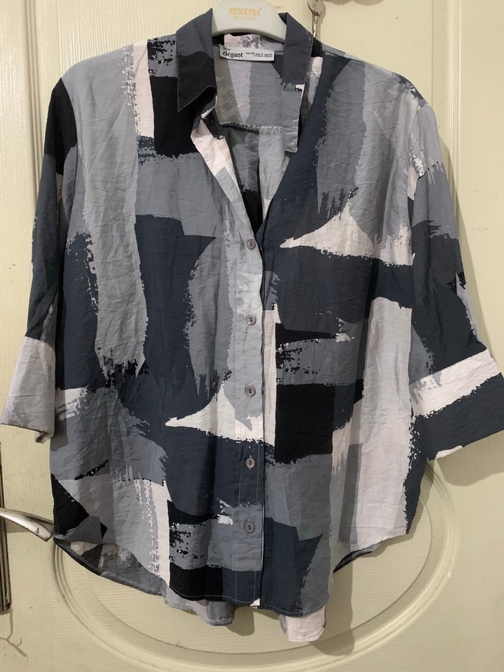 Gri keten gömlek, batik desenli, düğmeli ve yakalı. Kısa kollu, rahat kesim, günlük sokak stili için uygun.