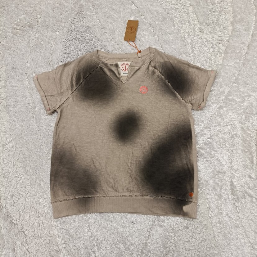 Gri keten kumaştan, kısa kollu, yuvarlak yakalı ve batik desenli, rahat kesim kadın tişörtü. Trend ve sokak modasına uygun.