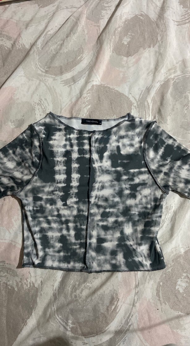 kısa kollu, tekne yaka, gri batik desenli, dar kesim, günlük sokak tarzı bluz.