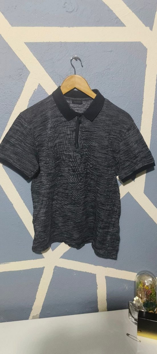 Gri batik desenli, kısa kollu, düğmeli yakalı regular fit erkek polo tişört.