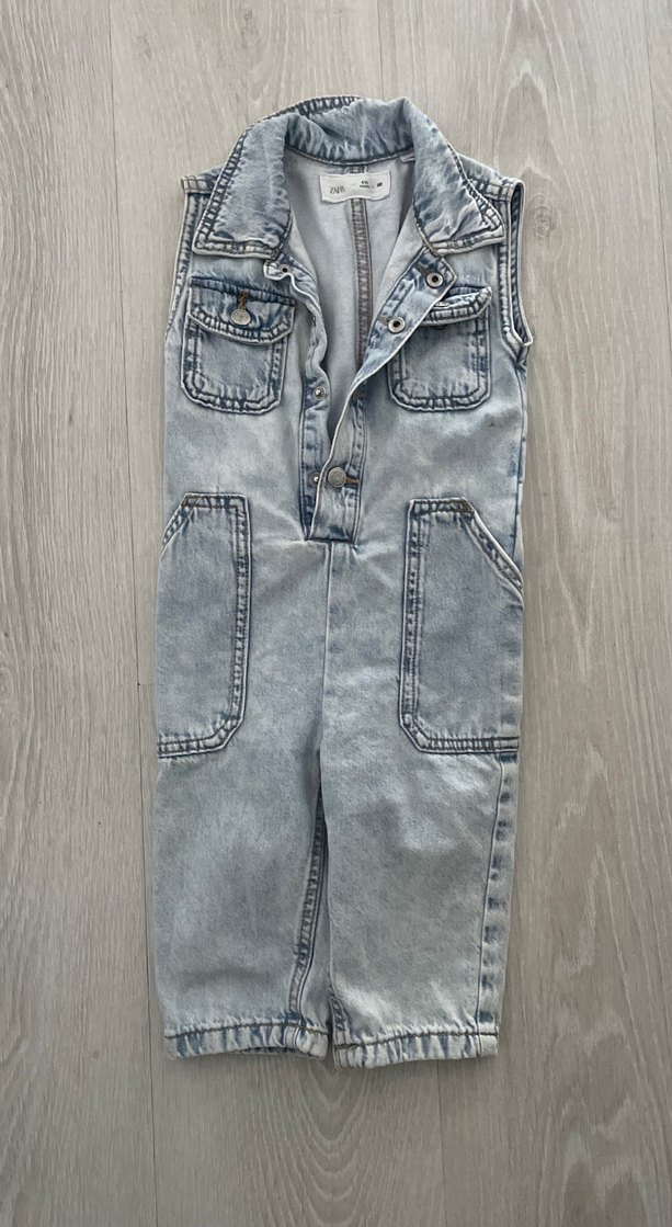 Düğmeli, cepli, gri batik desenli erkek çocuk kot tulum, kolsuz ve regular fit kesimle sokak tarzına uygun. Bir kaç kez giyildi yeni gibidir.