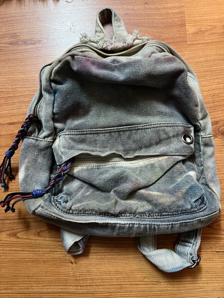 Gri kot malzemeden yapılmış, batik desenli ve tokalı detaylara sahip, günlük kullanıma uygun grunge punk ve bohem tarzda sırt çantası. Sıfır ürün hiç kullanılmadı. Kolundaki kağıt etiketi bile çıkarmadım. Alacalı renklerde boyalı kot kumaşı gibi bir kumaşı var. Uzunluğu 40 cm, genişliği 33 cm, derinliği 12 cmdir