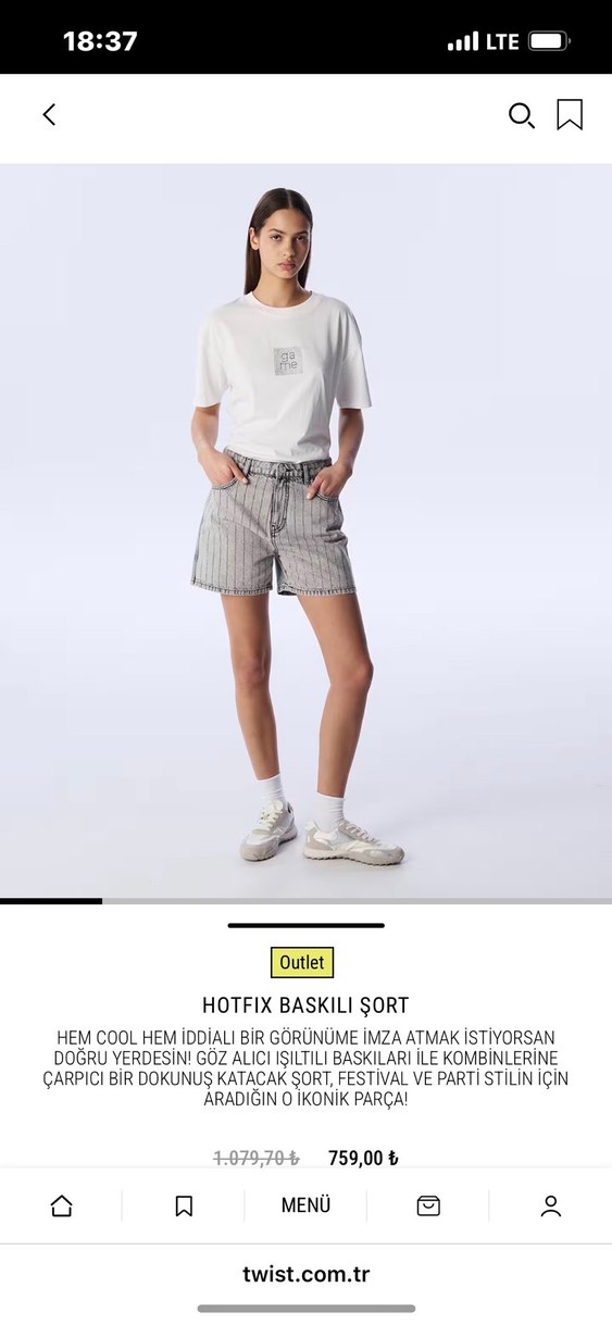 Gri batik desenli, bol kesim mini denim şort. Parlak hotfix baskılarla dikkat çeken rahat ve şık bir sokak tarzı. Günlük ve festival kullanımı için ideal.
