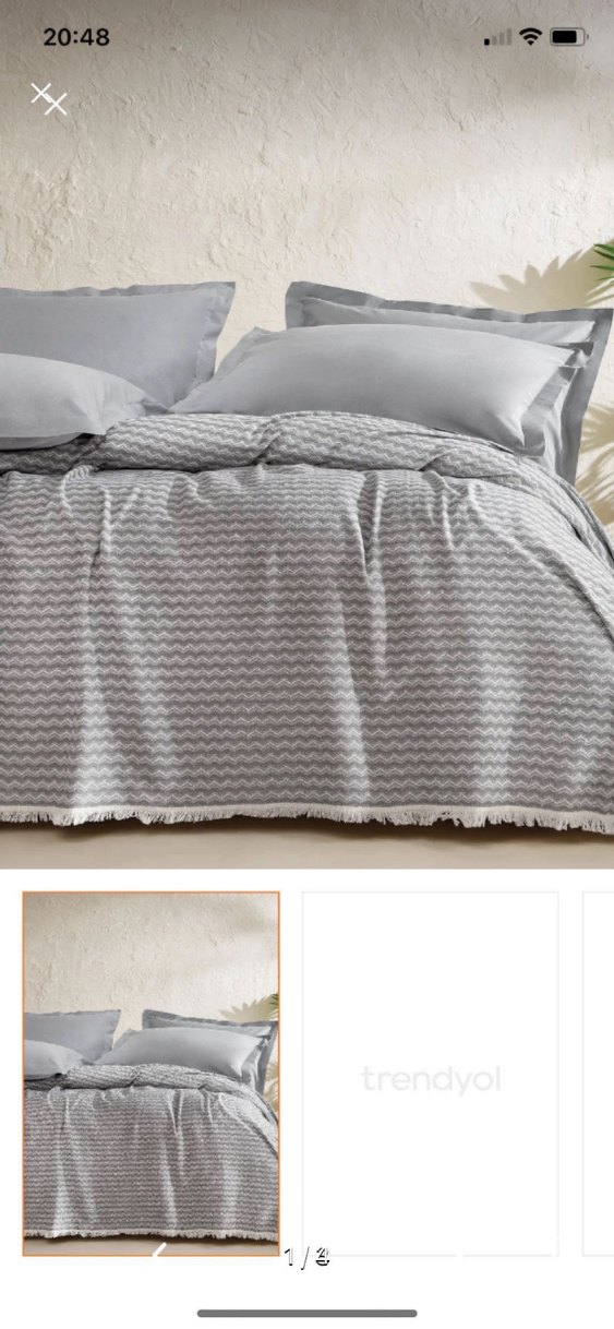 Gri renkte, batik desenli, yumuşak dokulu ve püsküllü kenarlara sahip nevresim ve çarşaf takımı. ️