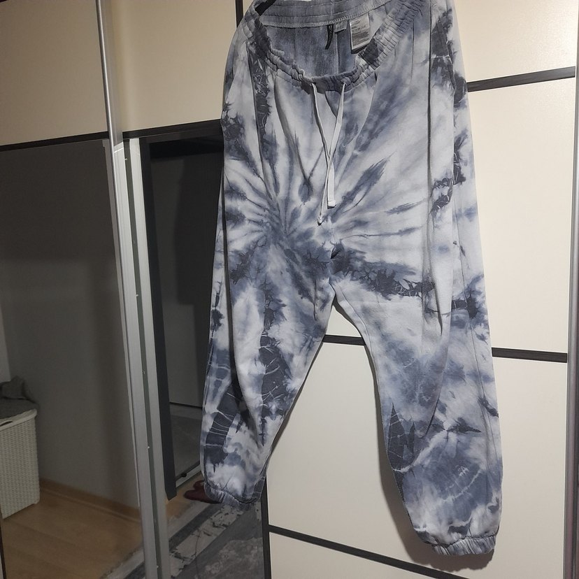 Gri batik desenli, bol kesim kadın eşofman. Denim kumaştan, drapeli tasarıma ve normal boyda dış mekan kullanımı için uygun. oldukça büyük kalın içi yünlü