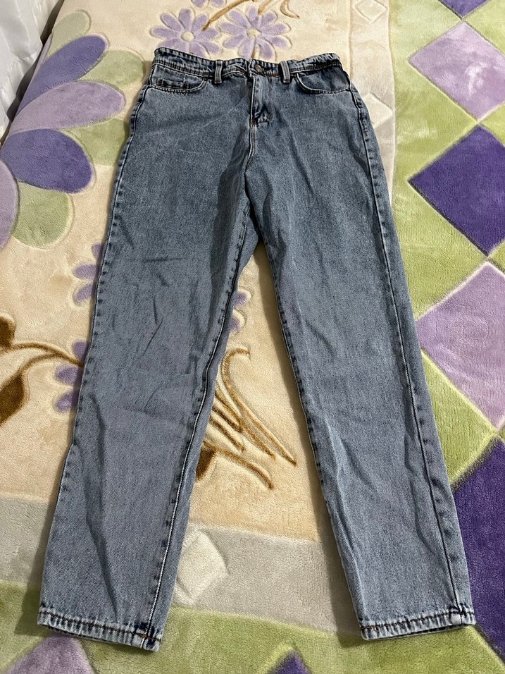 Gri batik desenli, rahat kesim kadın kot pantolon. Normal boy midi uzunluğunda, günlük kullanım için uygun rahat ve şık bir tasarım.