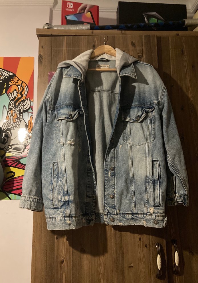 Gri batik desenli, düğmeli, salaş kesim uzun kollu erkek denim ceket. Notlu yaka detayıyla günlük sokak stiline uygun.