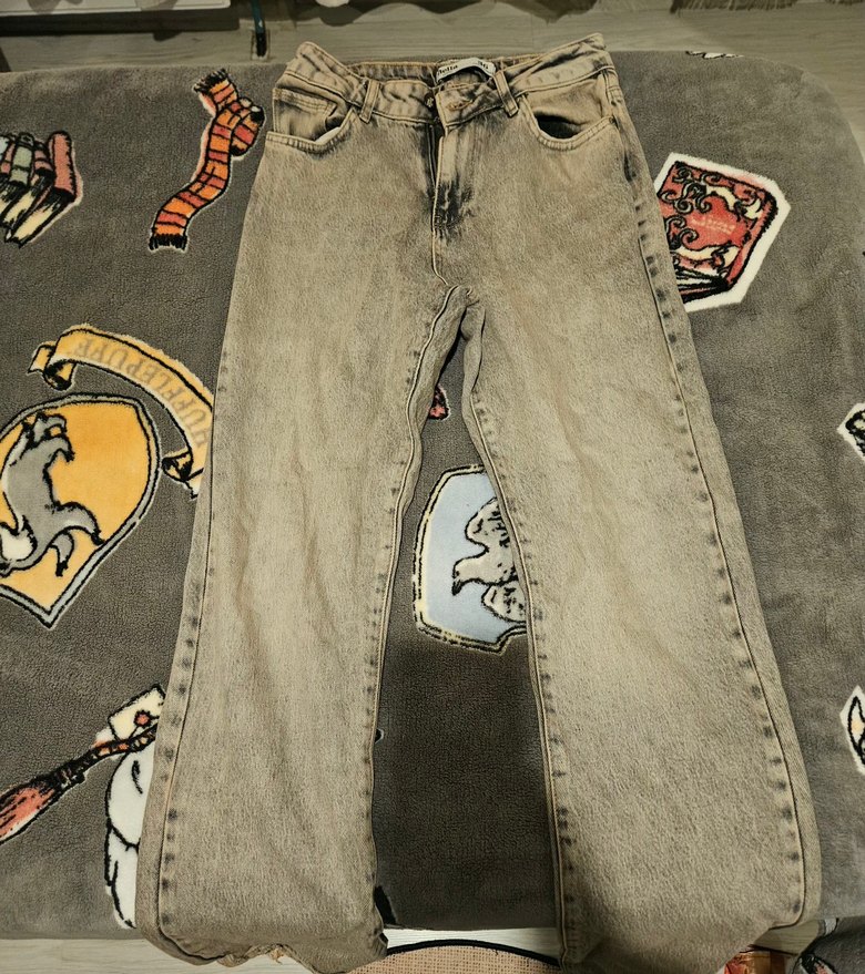 Gri batik desenli denim kot pantolon, salaş kesim ve midi boyda, yırtmaç detaylıdır, günlük sokak stili için uygundur.