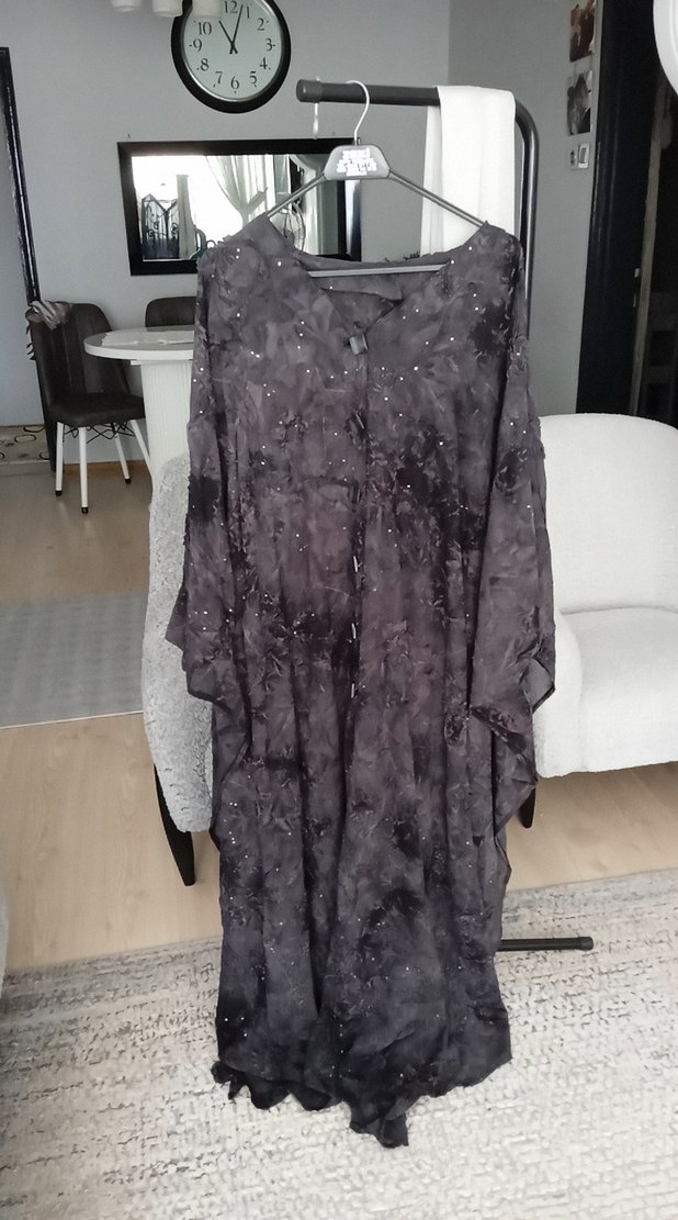 Gri batik desenli, uzun kollu, V yakalı, bol kesim ve dökümlü şifon kumaş elbise. salaş pelerin tarzı yanlardan açık istenirse bedene göre dikiş atılabilir ben iki turlu kullandım sadece kol ucu dikili gerisi acik