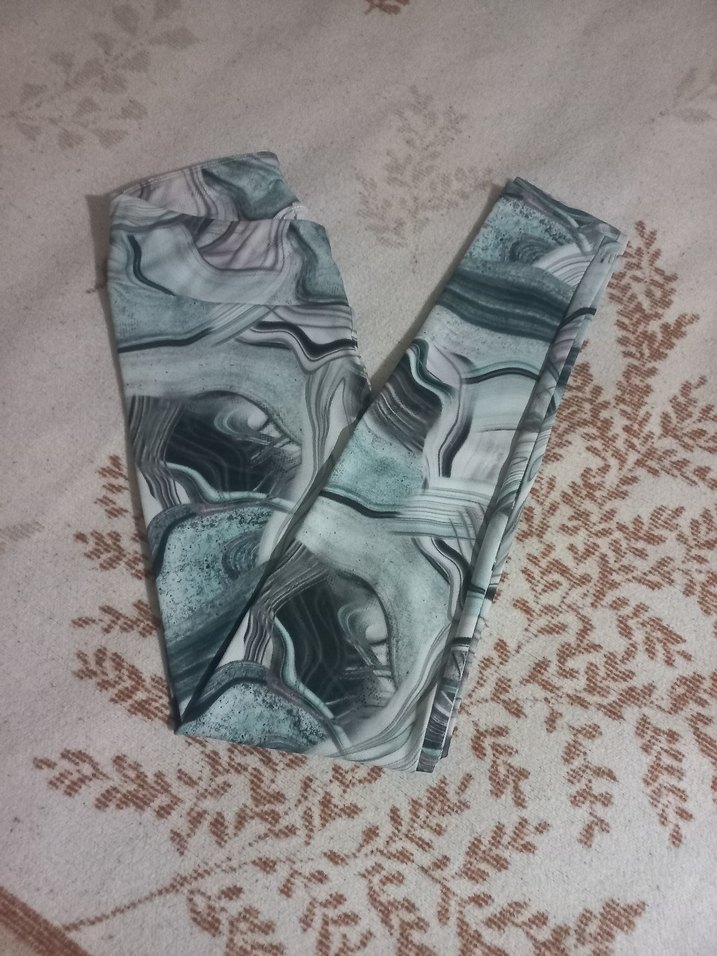 Gri batik desenli, elastik bel bantlı, yumuşak sentetik kumaştan üretilmiş uzun kadın tayt. Günlük sokak tarzı için uygundur.