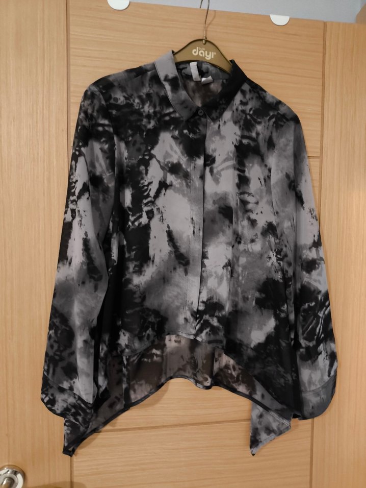 Gri batik desenli, ipeksi kumaştan yapılmış, düğmeli ve yüksek yakalı bol kesim kadın gömleği, grunge punk tarzına uygun.