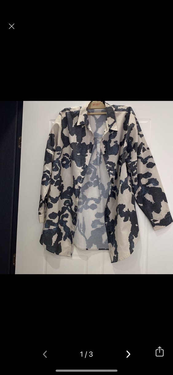 Gri batik desenli, uzun kollu, düğmeli ve yakalı keten kadın gömleği. Rahat kesimli, günlük kullanıma uygun sokak stili.