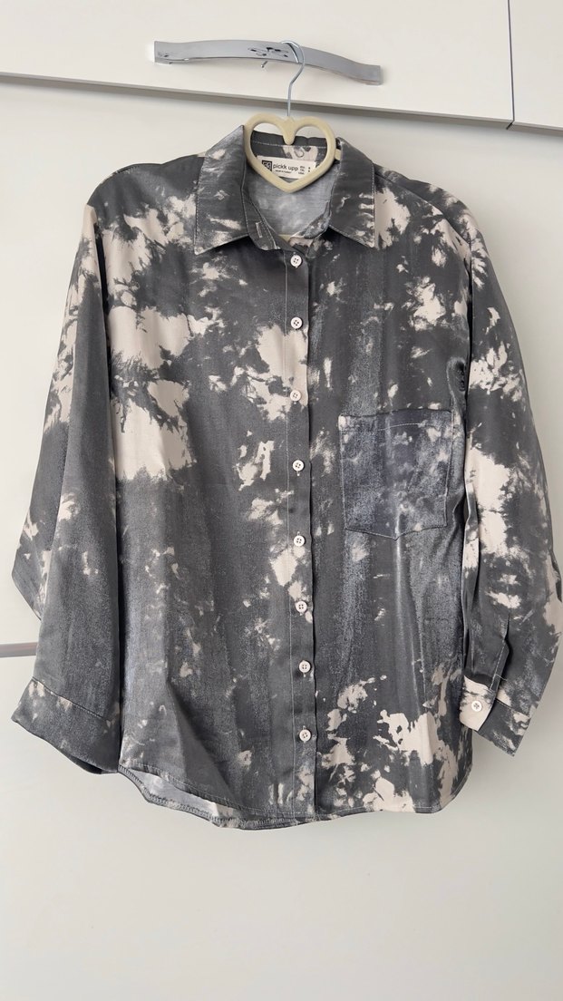 Gri batik desenli, keten kumaştan uzun kollu, düğmeli ve yakalı kadın gömleği. Rahat ve salaş kesimi günlük kullanıma uygundur.