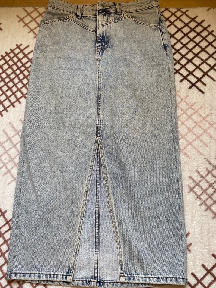 Önünde yırtmaç bulunan, gri batik desenli, bol kesim uzun kot etek. Günlük rahat kullanım için uygundur.