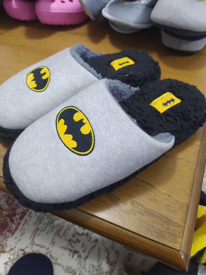 Gri renkte, Batman baskılı erkek çocuk ev terliği. Yumuşak ve sıcak fleece astar ile Velcro bantlı, rahat giyilir.