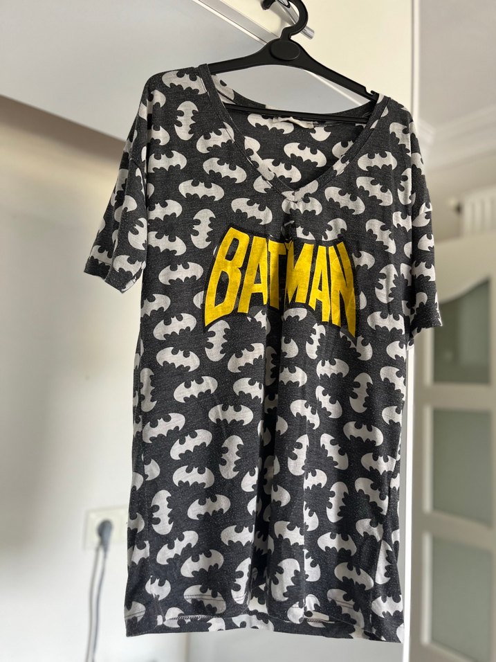 Gri renk, kısa kollu ve V yakalı bol kesim tişört. Batman baskılı, pop kültür tarzında.