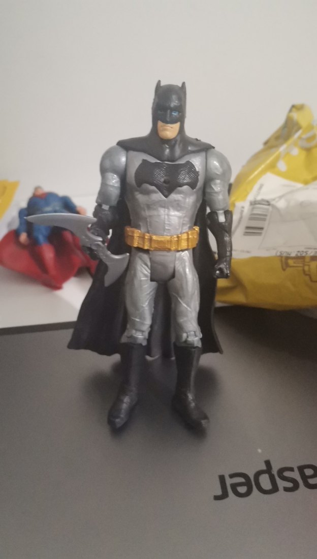 Bu Batman figürü gri kostüm. 15 cm, siyah pelerin ve sarı kemer ile tasarlanmıştır. Figür, bir batarang tutar ve kahramanca duruş sergiler.