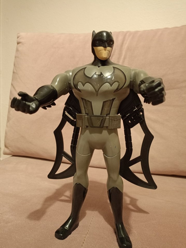 Gri renkte Batman figürü, göğsünde detaylı yarasa sembolü, siyah eldiven ve çizmeler ile birlikte çıkarılabilir yarasa şeklinde pelerin içerir.