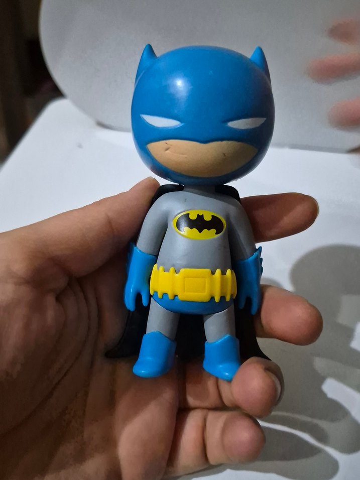 Gri renkte Batman figürü, mavi eldivenler, botlar ve maske, sarı kemer ve göğüste Batman logosu ile.