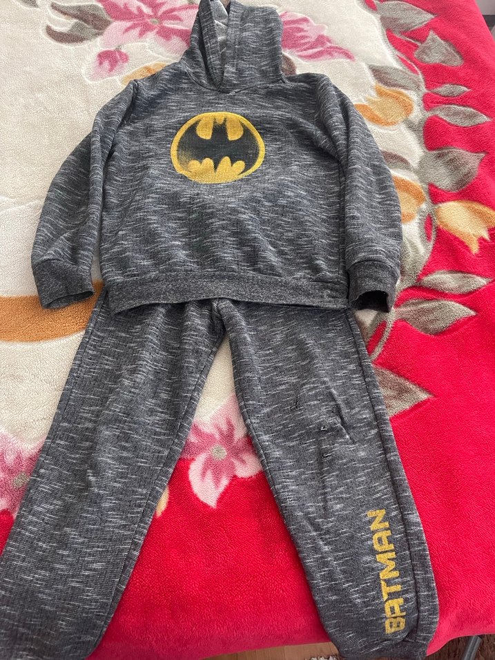 Kapüşonlu sweatshirt ve eşofman altından oluşan, yumuşak örme gri kumaşlı, fitted kesim erkek çocuk eşofman takımı. Sweatshirt önünde Batman baskısı ve alt paçada Batman yazısı bulunur.