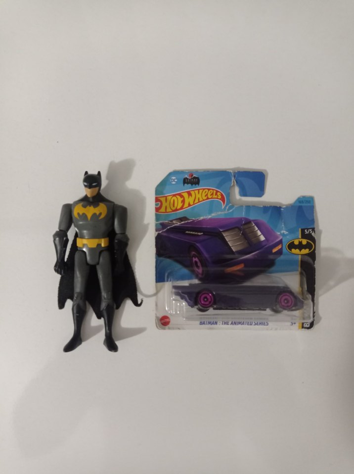 Koyu gri Batman figürü ve pembe tekerlekli mor Hot Wheels oyuncak arabadan oluşan set. Toplu Fiyattır.