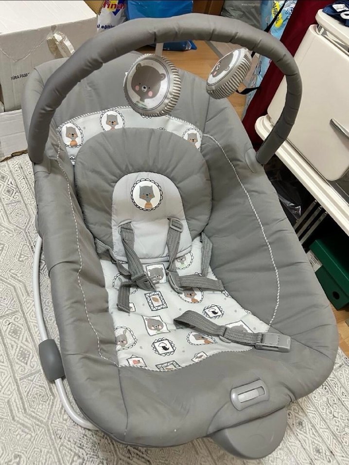 Bi kez kullanıldı 3 kademesi mevcut İhtiyaç fazlası olduğu için satıyorum Ayarlanabilir kayışlı, yumuşak kumaşlı ve oyuncaklı gri bebek , ana kucağı konfor ve eğlence sağlar.