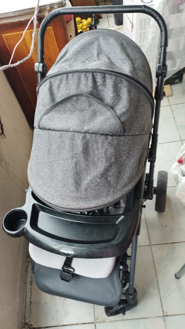 Gri renkli bebek arabası, tente ve bardaklıklı tepsi ile konforlu ve kullanışlıdır. ufak tefek çizik kırıkları var az killalıldı