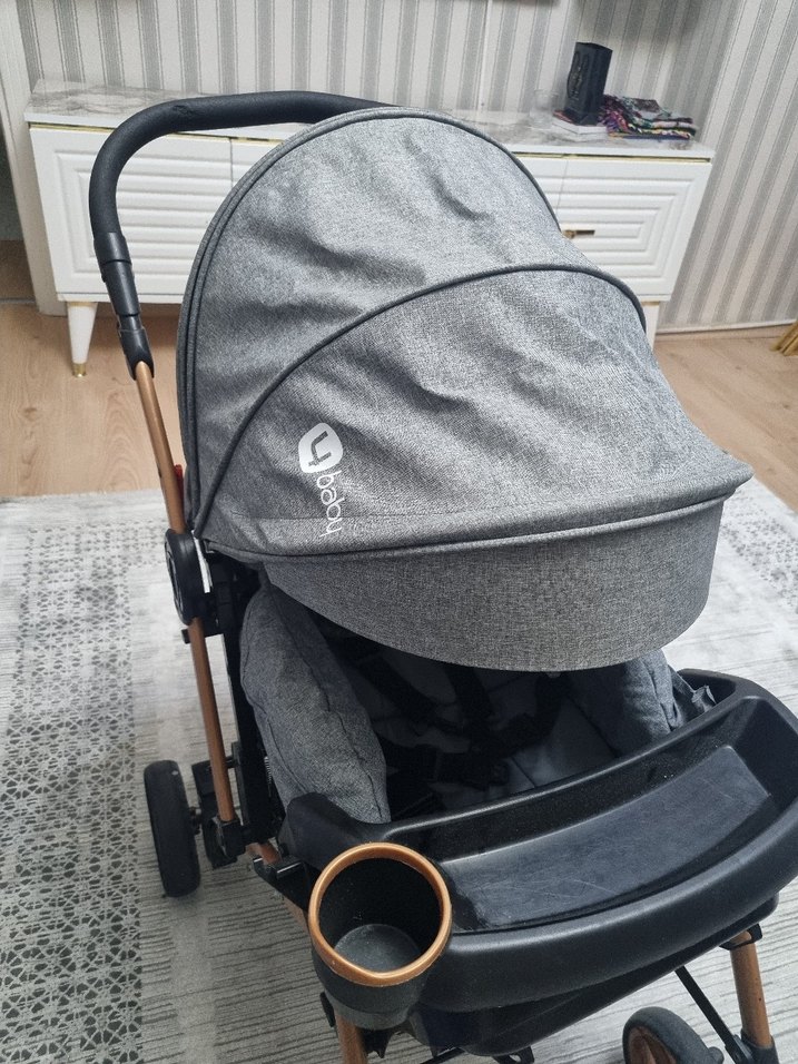Gri renkli bebek arabası, dayanıklı iskelet, ayarlanabilir tente ve kullanışlı bardak tutucuya sahiptir. Rahat ve pratik bir üründür.çift yünlü 3 yıllık hiçbir sorunu yok temiz fazla kullanılmadı