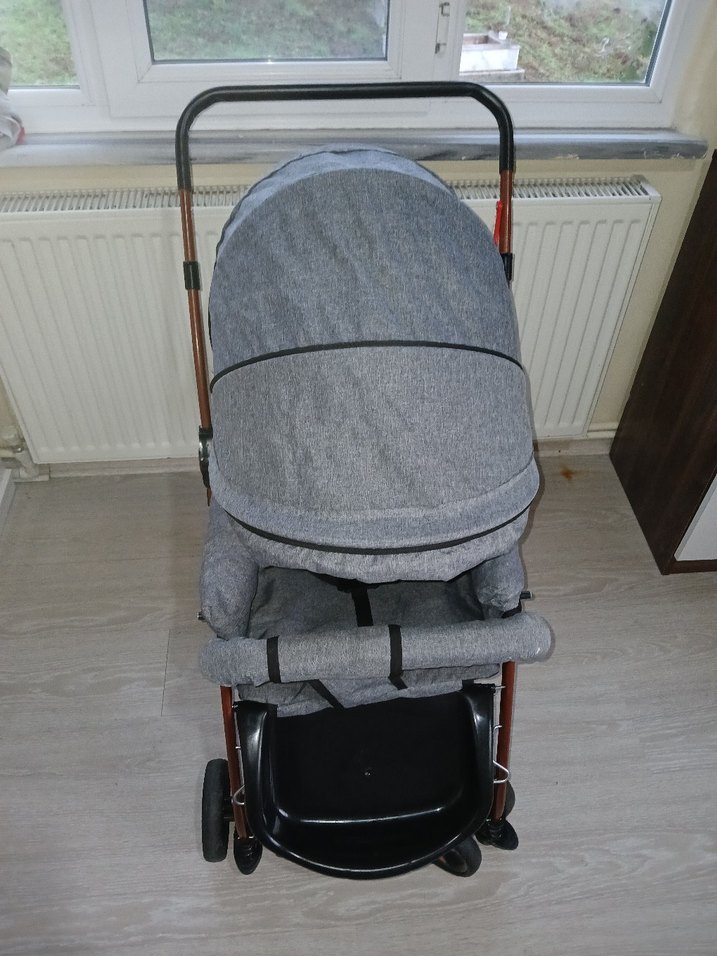 Gri bebek arabası, kapaklı oturma yeri ve alt kısmında saklama sepeti ile dayanıklı yapıya sahiptir. Tutma kolu ve tekerlekleriyle kolay hareket ettirilir.