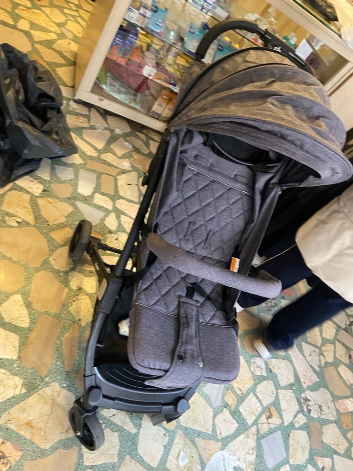 Gri bebek arabası, konfor için yastıklı oturma alanı ve koruyucu tente içerir. Güvenli bar ve sağlam tekerleklerle rahat hareket sağlar.