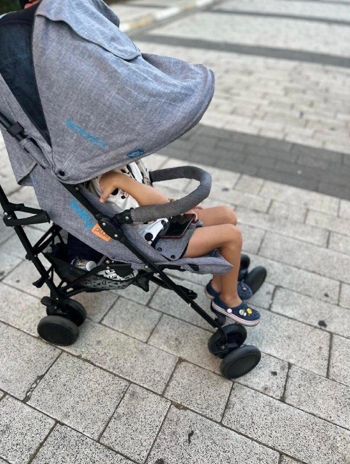 Gri renkte, yumuşak kumaş tente ve güvenli kemerli bebek arabası. Kolay hareket için pürüzsüz tekerlekler ve konforlu oturma alanı bulunur. Sadece biraz kirli