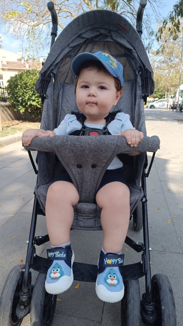 Gri renkli bebek arabası, sağlam iskelet ve konforlu oturma alanı sunar. Güvenlik kemeri ve tente içerir.