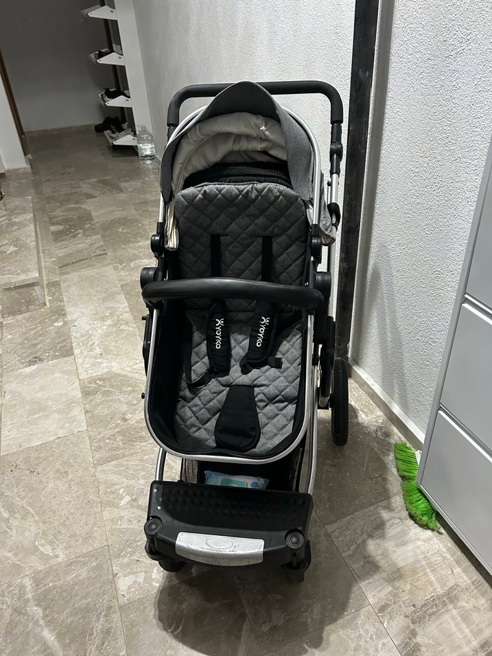 Yoyko marka Gri bebek arabası, yastıklı koltuk, emniyet kemeri, ayarlanabilir tente ve sağlam çerçeveye sahiptir. Sadece puset kullanıldı.
