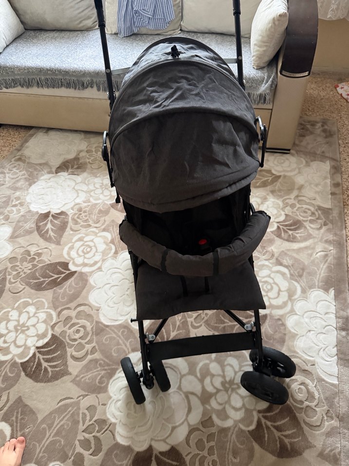 Gri renkte, tente ve yumuşak ön barlı bebek arabası. Dört tekerlekli, kolay hareket ettirilebilir ve kompakt yapıda.