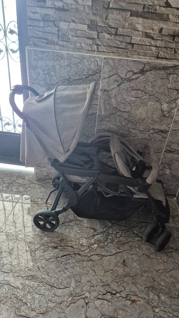 Gri renkli, tente ve alt kısmında saklama sepeti bulunan bebek arabası. Konforlu ve kullanışlıdır.