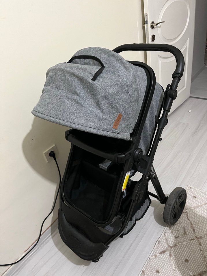 Gri renkli bebek arabası, sağlam iskelet ve geniş tente ile donatılmıştır. 4 tekerlekli yapısı kolay kullanım sağlar, altta saklama sepeti vardır.
