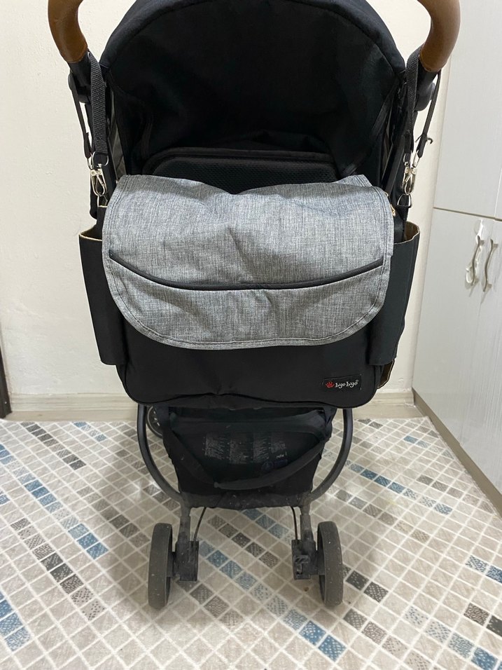 Gri bebek arabası, yumuşak kumaş kapak ve sağlam tekerleklerle konforlu gezintiler için tasarlanmıştır.