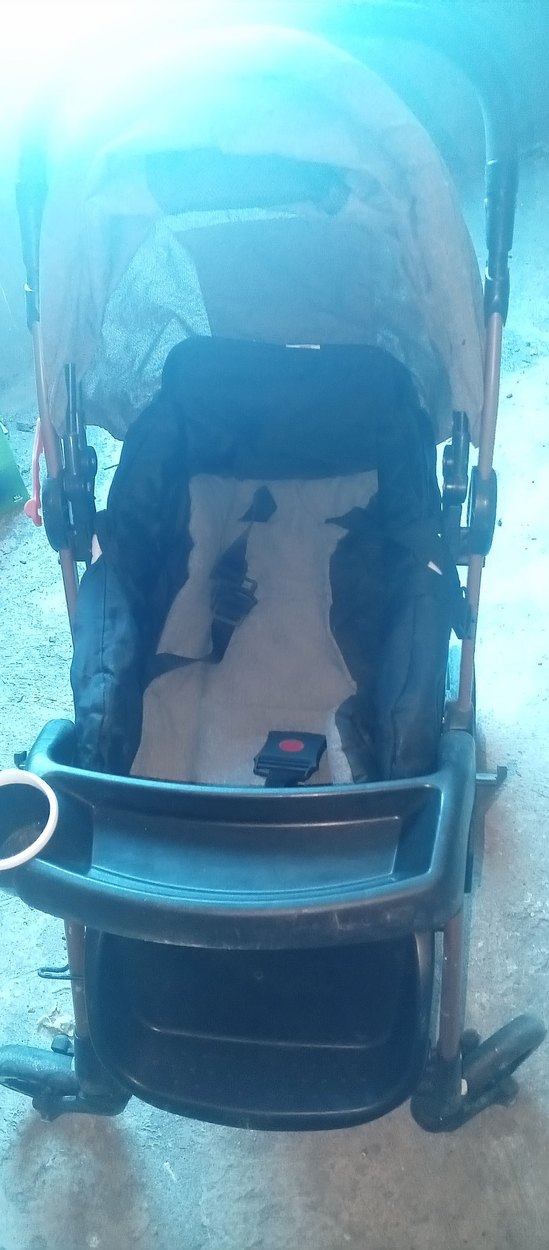 Gri bebek arabası, güvenli emniyet kemeri ve bardaklık içeren ön tepsi ile konfor ve kolaylık sağlar.