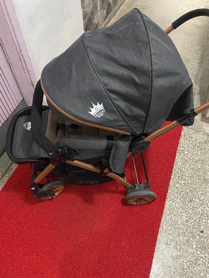 Gri renkli bebek arabası, güneş korumalı tente ve konforlu yastıklı oturma alanına sahiptir. Dayanıklı iskelet ve kolay hareket sağlayan tekerlekleri bulunur.